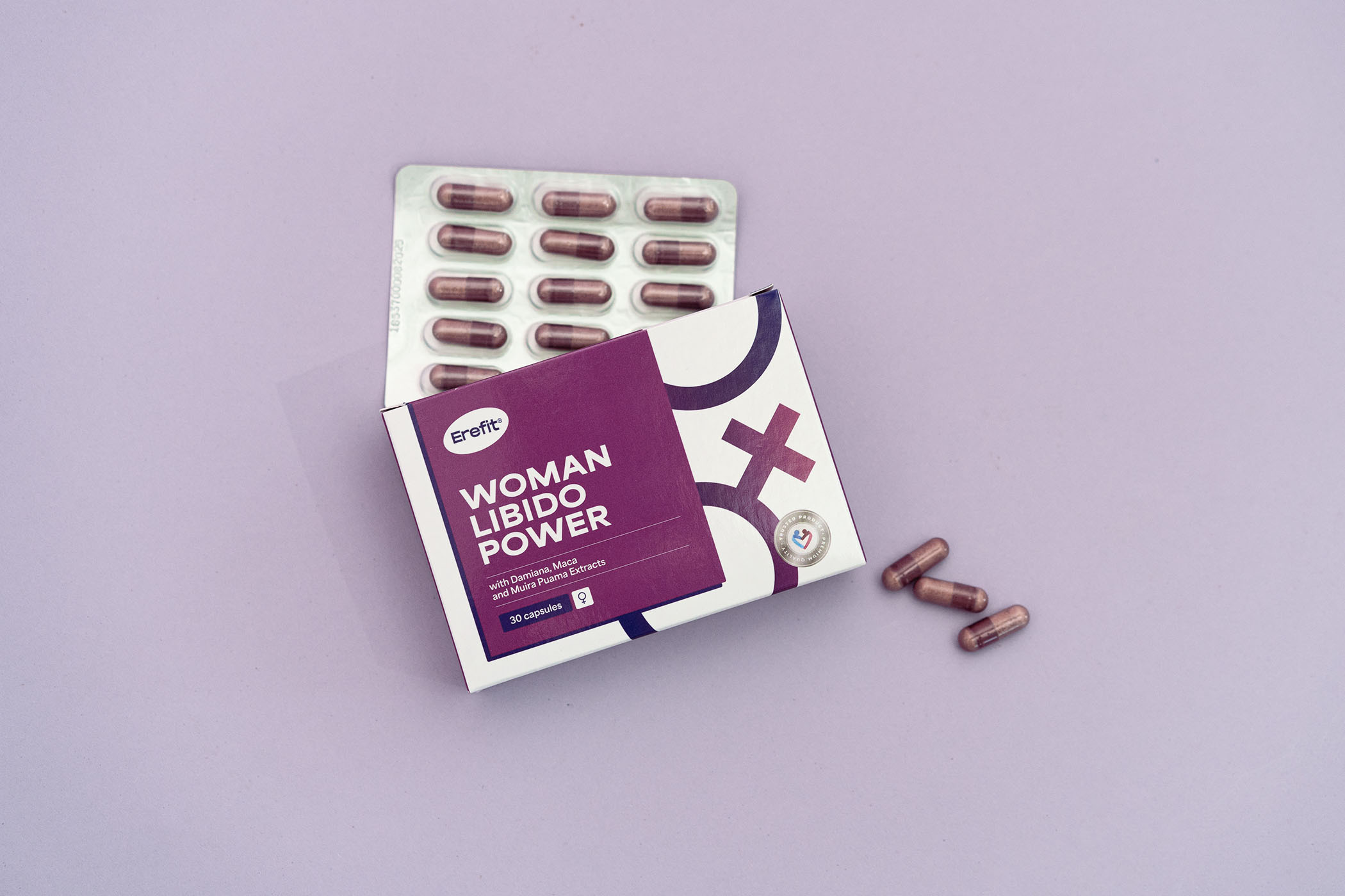 Inhaltsstoffe: Hydroxypropylmethylcellulose (HPMC; pflanzliche Kapselhülle), Trockenextrakt aus Damianablättern (Turnera diffusa), mikrokristalline Cellulose (Füllstoff), Macawurzel-Trockenextrakt (Lepidium meyenii), Ingwer-Trockenextrakt (Zingiber officinale), titriert auf 1 % Gingerole, Ginsengwurzel-Trockenextrakt (Panax ginseng), titriert auf 2 % Ginsenoside, Sojabohnen-Trockenextrakt (Glycine max), titriert auf 10 % Isoflavone, Magnesiumsalze der Speisefettsäuren (Trennmittel), Siliziumdioxid (Trennmittel), L-Arginin, Trockenextrakt aus Muira-Puama-Rinde (Ptychopetalum olacoides).